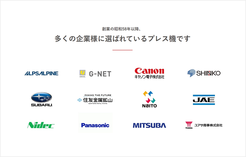 当社では、お客様のニーズに対応したプレス機及び各種専用機の開発製造に際し、高品質、低価格、短納期、納入後の万全のアフターサービスをモットーに、常にお客様にご満足いただける製品とサービスの提供に全社をあげてこれからも取り組んで参ります。