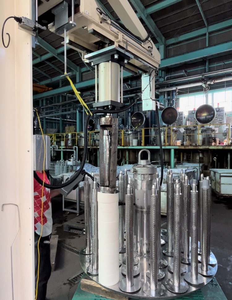 染色する際に人力で糸を圧縮していたが、労力と時間を要する割には効果が限定的であった。そこで弊社プレス機を応用し、ボビンのサイズに合わせてカスタマイズした自動加圧機を導入。繊維に油が付着する可能性をゼロにするため、油圧シリンダーではなくエアシリンダーを使用した。