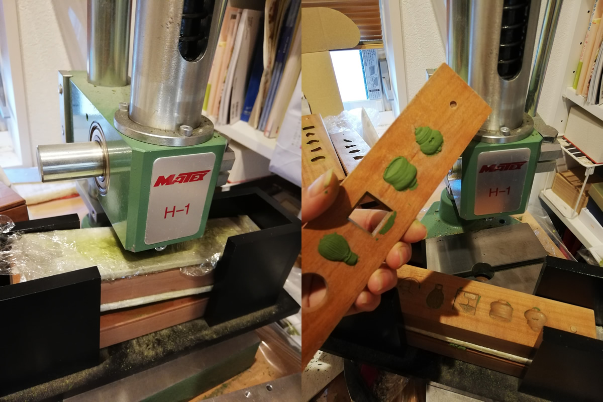 製造行程の中で最も腕の力が必要となる型抜きの作業でハンドプレス機を導入。